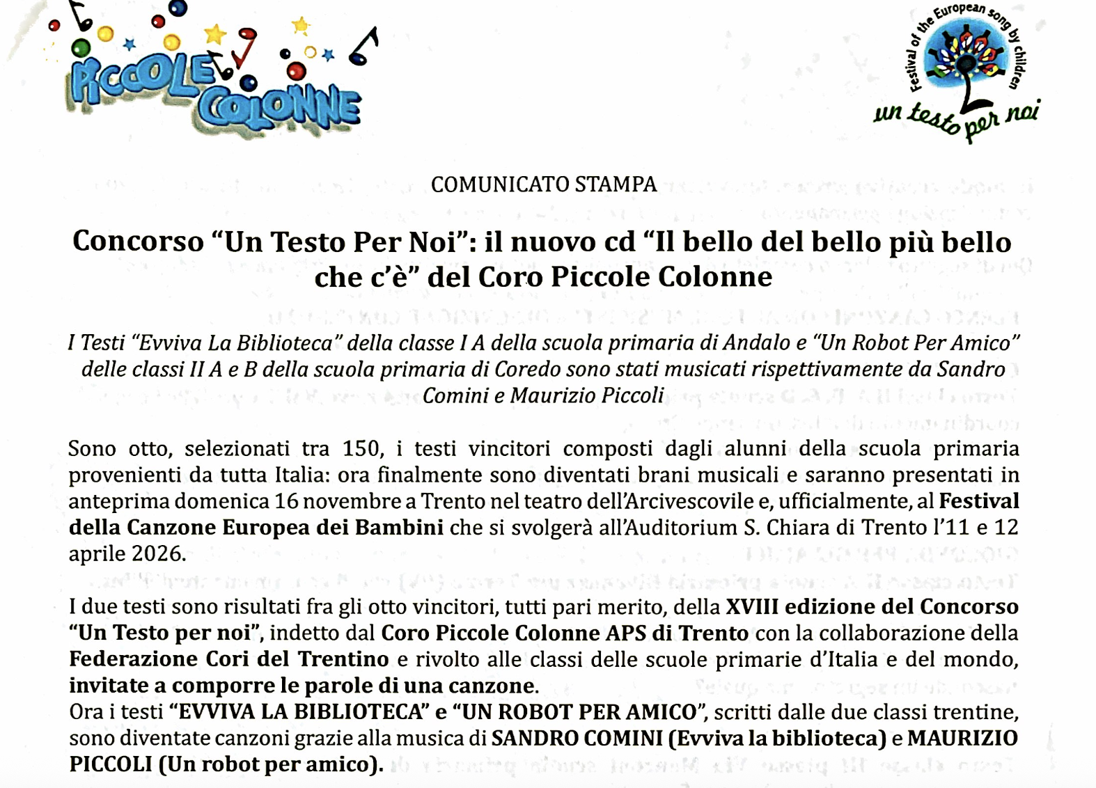 Essa sarà ufficialmente presentata nel corso del "Festival della Canzone Europea dei Bambini" che si svolgerà a Trento il prossimo aprile 2026.