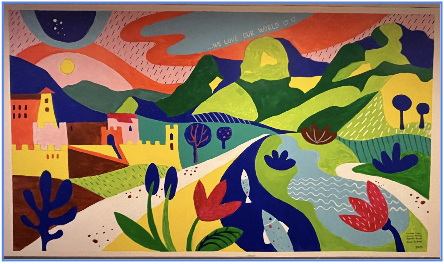 Nel primo progetto, dedicato al paesaggio della Piana Rotaliana, i ragazzi hanno trasformato le pareti del corridoio della mensa in un racconto visivo del territorio: il castello, il torrente Noce, i profili delle montagne. Un modo per celebrare le proprie radici e per lasciare un segno tangibile e duraturo nella scuola, con un messaggio di cura e gratitudine sintetizzato nella frase “We love our world”.