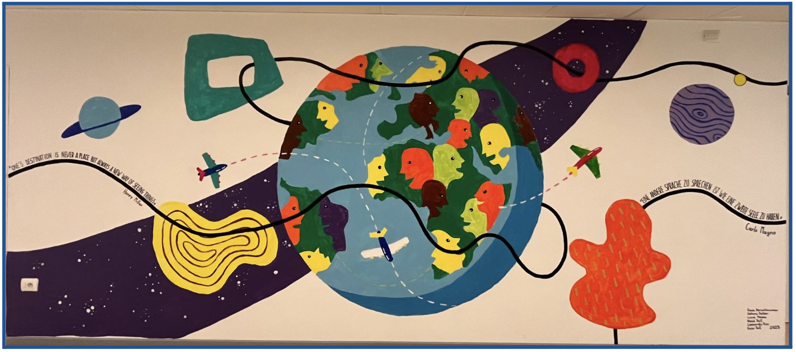 Il secondo murale, “Speak beyond the borders”, guarda invece oltre i confini. Sulla parete delle aule di lingue prende forma un grande globo fatto di volti che dialogano, simbolo dell’incontro tra culture e dell’importanza di comunicare e comprendersi. Le frasi scelte dai ragazzi – “One’s destination is never a place but always a new way of seeing things” e “Eine andere Sprache zu sprechen ist wie eine zweite Seele zu haben” – raccontano il valore della diversità e la ricchezza del sapere condiviso.