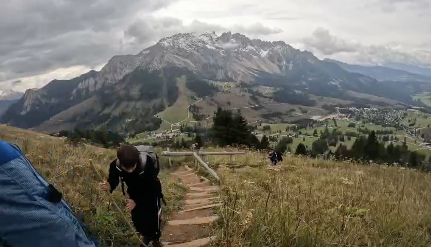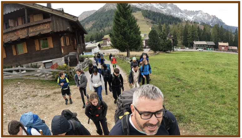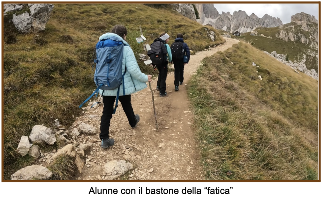 Dopo circa un’ora e mezza di cammino, l'esercito ha raggiunto il Rifugio Paolina, dove i ragazzi, entusiasti ma visibilmente affaticati, hanno potuto finalmente godersi il meritato pranzo. Terminato il pasto, i docenti hanno proposto alcune attività creative, tra cui l’esercizio del "bastone del viaggio": un bastone raccolto nel bosco al quale gli alunni hanno attaccato dei foglietti su cui erano state scritte le emozioni provate durante la salita. Nonostante la varietà delle frasi, tutte le sensazioni espresse dai ragazzi si potevano riassumere in una sola, potente parola: fatica. Dopo questo momento di condivisione emotiva, il gruppo è ripartito con la consapevolezza che la meta finale, il Rifugio Roda di Vael, era sempre più vicina e che il leggendario giardino delle rose stava per svelare i suoi incanti.