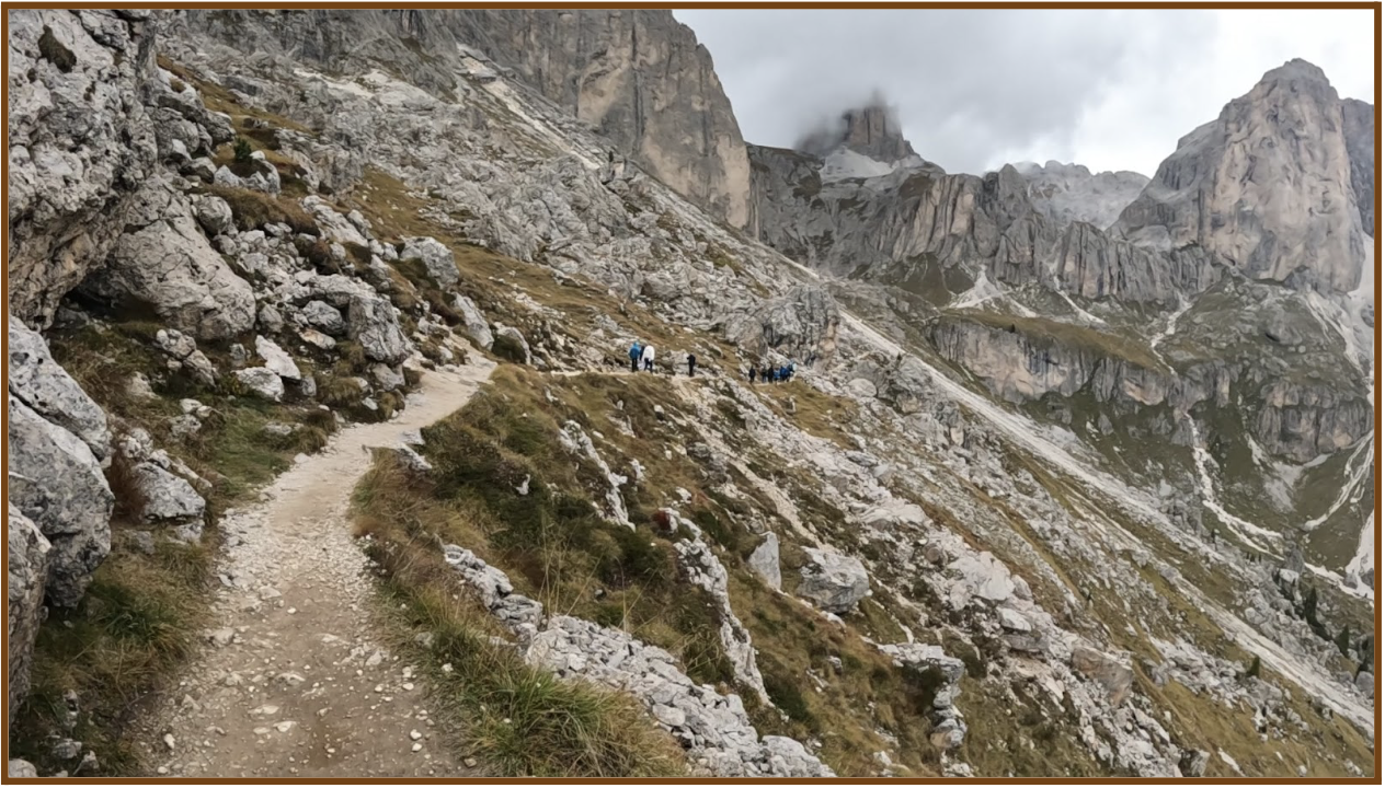 Il tratto successivo, dal Rifugio Paolina al Rifugio Roda di Vael, prevedeva un percorso più dolce, caratterizzato da lievi saliscendi per alcune centinaia di metri. Rispetto alla marcia precedente, la fatica è stata decisamente minore, e la vista mozzafiato sui monti circostanti ha reso il cammino più leggero. Lungo il sentiero, il gruppo ha incontrato l’Aquila di Christomannos, una grande opera artistica in bronzo, alta circa tre metri, dedicata a Theodor Christomannos, il pioniere austriaco del turismo nelle Dolomiti. Questa maestosa scultura è posizionata in un punto panoramico eccezionale, a quota 2.300m, dal quale si abbraccia con lo sguardo un ampio panorama della Val di Fassa, con le cime delle Pale di San Martino e della Marmolada in tutta la loro splendida imponenza.