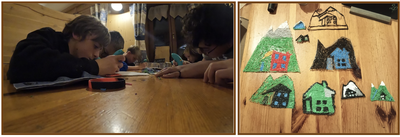Siamo rientrati in rifugio puntuali alle 18:30, giusto in tempo per gustare l’ottima cena preparata con cura, che prevedeva un sostanzioso piatto di pasta seguito da un secondo a scelta tra pollo e patate o frittata. Tutti hanno gradito il pasto in abbondanza. Successivamente, i docenti hanno organizzato un coinvolgente laboratorio serale utilizzando le penne 3D, chiedendo agli alunni di riprodurre il simbolo del rifugio con il materiale messo a disposizione. I lavori si sono protratti fino alle 21:30 e alcuni risultati sono stati talmente ben realizzati da indurci a regalarli alla rifugista come ringraziamento.